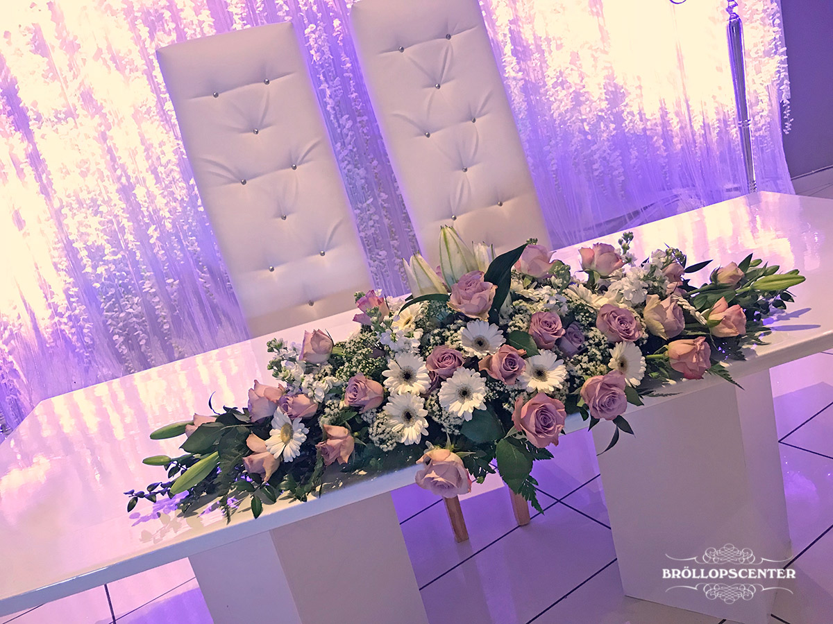 Dekorera med personliga detaljer som fotografier av paret, och kanske en välkomstskylt med deras namn och datum. Små bord med ljuslyktor, blommor och romantiska textilier som spetsdukar kan komplettera utsmyckningen för att göra tillfället extra speciellt.
